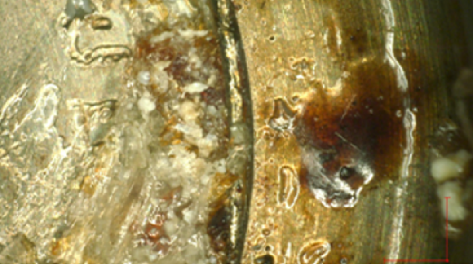 附着在肉眼可见的程度的沉积物。不能通过超声波清洗去除,即使刮掉也可以损坏模具。